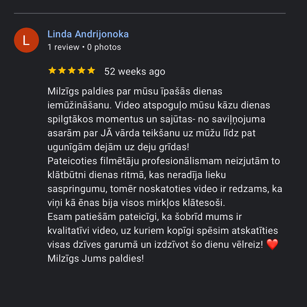 Mēs radam sajūtas un emocijas. Jau vairāk kā 460 pāri ir uzticējušies mums un saņēmuši daudz pozitīvas emocijas.